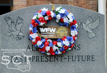 In honor of those who served, and those who lost their lives, Post member Larry Jones placed a memorial wreath upon the Shelby County Veterans Memorial.