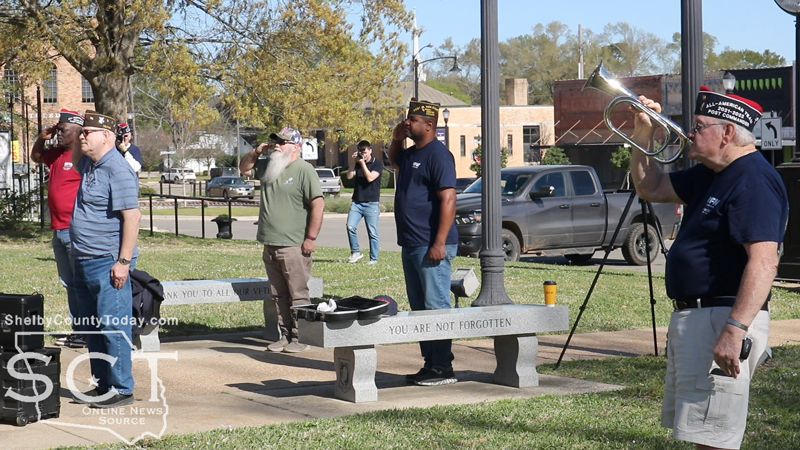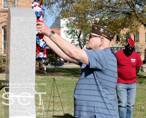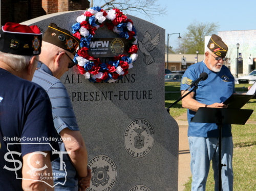 In honor of those who served, and those who lost their lives, Post member Frank Miller placed a memorial wreath upon the Shelby County Veterans Memorial.