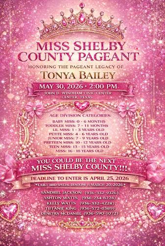 The pageant, honoring the pageant Legacy of Tonya Bailey, is Saturday, May 30, 2026 at the John D. Windham Civic Center, 146 Express Boulevard, Center, Texas 75935. The pageant starts at 2pm with interviews for contestants over 10 years of age starting at 10am.