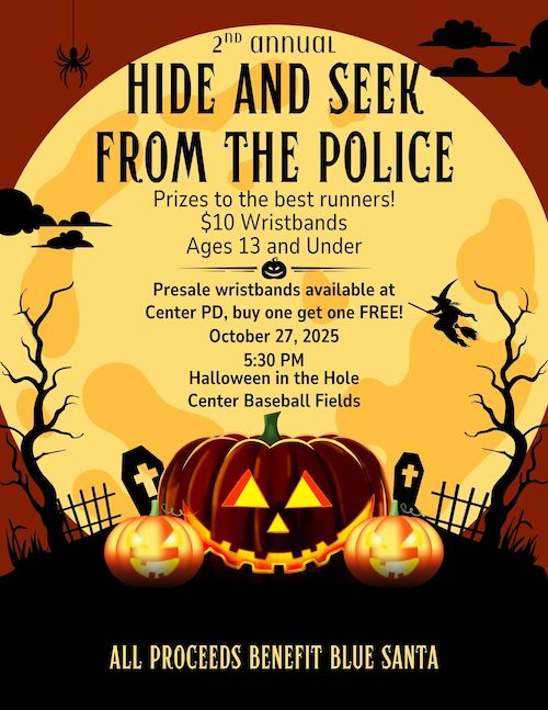October 14, 2025 - The Center Police Department Ladies Auxiliary and Operation Blue Santa are looking for the fastest runners with the 2nd Annual Hide and Seek from the Police!