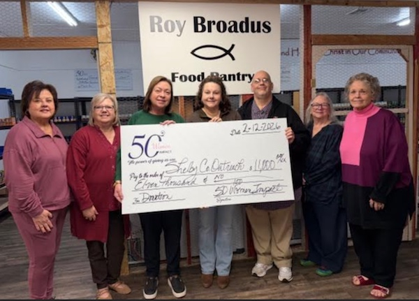 February 16, 2026 - The 50 Women Impact Group has awarded the 2026 first quarter grant in the amount of $11,000 to Shelby County Outreach Ministries, a non-profit group who began in 1997 feeding the hungry and assisting the needing in Shelby County. What began as a free Thanksgiving meal has now expanded to four programs: The Helping Hands Outreach Center, Meal on Wheels, The Senior Nutrition Site and The Unique Boutique. Through these programs, the organization provides emergency food boxes, assists with utilities, medications, doctor visits, homelessness, and more.