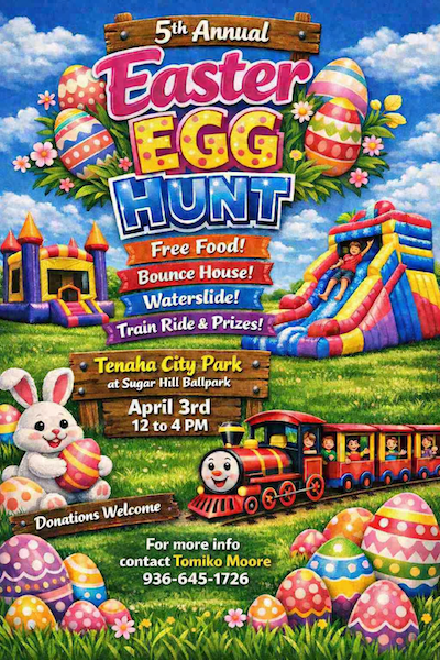 March 30, 2026 - 5th Annual Easter Egg Hunt at Tenaha City Park at Sugar Hill Ballpark on April 3, 2026 from 12-noon until 4pm.