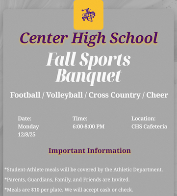 December 4, 2025 - The Center High School Fall Sports Banquet is Monday, December 8, 2025 from 6pm until 8pm in the CHS Cafeteria. The banquet is for Football, Volleyball, Cross Country, and Cheer.