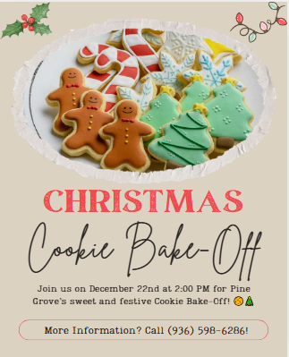 December 4, 2025 - Pine Grove is excited to announce our Christmas Cookie Bake-Off and would love for you to join in the fun on Monday, December 22nd! Thank you to everyone who has already entered—your holiday spirit makes this event so special.