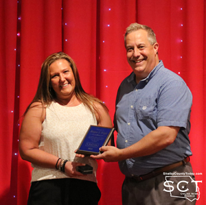 Chad Nehring (right) presents Maegan Wright (left) with a 10 years pin and plaque.