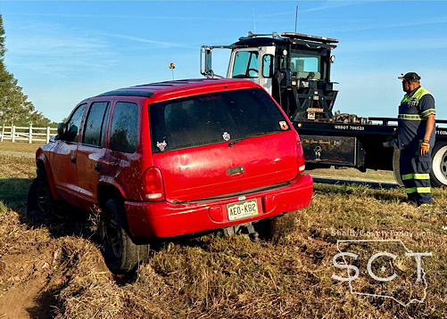 The preliminary crash investigation indicates that at approximately 7:45am, a red Dodge Durango driven by Doniqwa Moss, 33, of Center was traveling south and reportedly traveled off the road to the right and overturned into the southbound ditch.