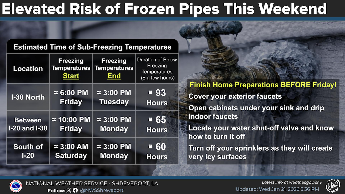 January 22, 2026 - Much of our area will see an extended period of time of sub-freezing temperatures. Right now we are looking at around 60-90 hours of below freezing temperatures across the region.