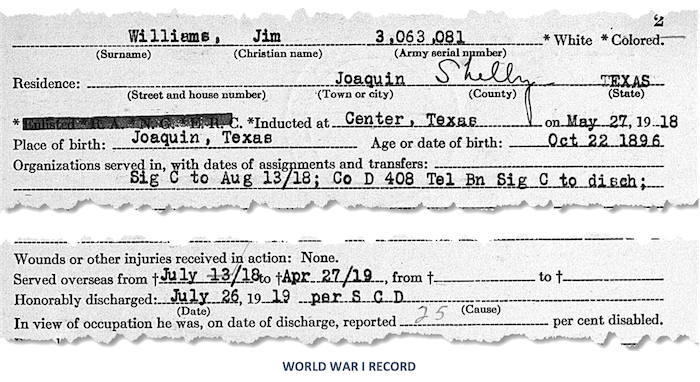 December 10, 2025 - Jim was born on Thursday, October 22, 1896, just six months after the opening of the first modern Olympic Games in Athens, Greece. His birthplace was the small far east Texas town of Joaquin, which is located in Shelby County. His parents were Jessie and William M. Williams and he is believed to have had five siblings; Laura (1892), Freddie (1897), Verry Arron (1902), Blair (1907), and Maggie (1912). The family lived on a rented farm located on Joaquin and Shelbyville Road in Precinct 4 of Shelby County.