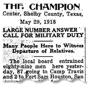 Receiving his draft notice, Jim took the oath of enlistment at the county seat of Center on Monday, May 27, 1918, becoming US Army Private Williams, serial # 6063081. The Champion newspaper, Center, Shelby County, Texas, May 29, 1918 gave this account of the activity that went on. “The local board entrained eighty-nine men here yesterday, 87 going to Camp Travis and 2 to Fort Sam Houston, San Antonio. At the Baptist Church Monday [May 27] afternoon a very large audience assembled to pay tribute to those going away. The services were very impressive and very much appreciated. Rev. C. H. Adams, Rev. F. L. Hall, and Hon. J. P. Anderson made appropriate talks. The Champion has a note this morning from two of the boys going away, asking us to express to the citizens here their appreciation for the splendid treatment during their time here, for the church services, and to those who cared for the ones remaining overnight here. Yesterday morning those going away lined up on Cora St. had their pictures made and then marched to the depot. The Elm Grove band came in and rendered splendid music. Practically every store in town closed and the crowd at the train was the largest that has gone their (sic) to see soldier boys off.” Of the 89 names listed, Calvin Ramey would not survive the war.