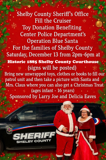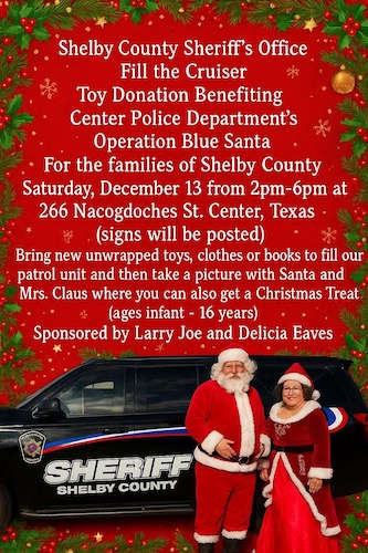 December 2, 2025 - Shelby County Sheriff's Office is hosting a "Fill the Cruiser" Toy Donation event benefiting Center Police Department's Operation Blue Santa for the families of Shelby County Saturday, December 13 from 2pm-6pm at 266 Nacogdoches St. Center, Texas (signs will be posted).