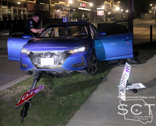 According to the Center Police Department, a blue 2023 Nissan Sentra driven by Corbin Odom, 22, of Center was eastbound on the square when the Nissan crossed over onto Austin Street before jumping the curb on the oncoming side of the roadway. The Nissan struck a stop/street sign at that intersection and came to a stop on the bump out alongside the sidewalk area. According to the CPD, Odom fled the area and was later located just up the roadway from the incident.