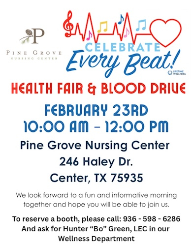 January 22, 2026 - Pine Grove Nursing Center is excited to announce that we will be hosting a Health Fair and Blood Drive on Monday, February 23rd at 10am.