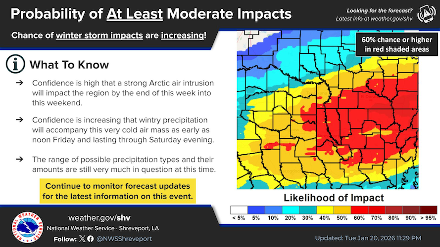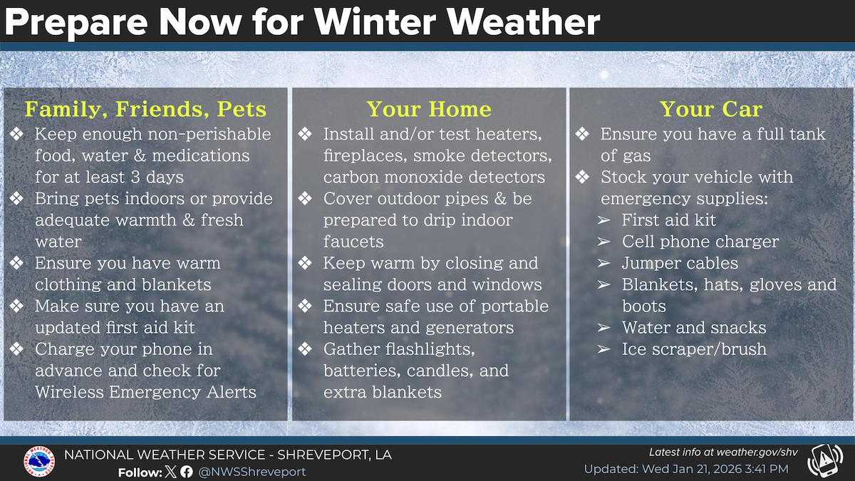 January 21, 2026 - Now is the time to prepare for potential winter weather this upcoming weekend. Make sure you make plans to care for your family, friends and pets, as well as make preparations for your home and car.