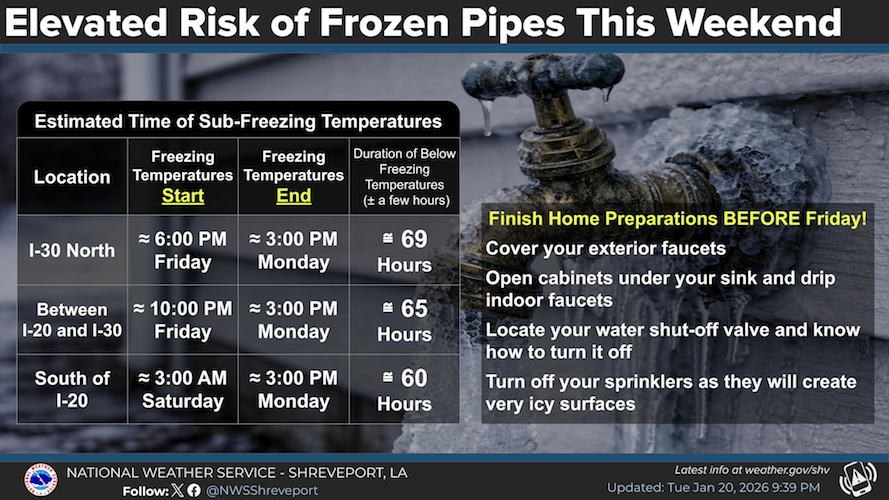 Much of our area will see an extended period of time of sub-freezing temperatures. Right now we are looking at around 60-70 hours of below freezing temperatures across the region. Make sure to finish home preparations before Friday.
