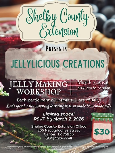 February 20, 2026 - The Texas A&M AgriLife Extension Service in Shelby County invites community members to join its Jellylicious Creations workshop on Saturday, March 7, 2026, from 9am to 12 noon at the Shelby County Extension Office, 266 Nacogdoches Street, Center, Texas.