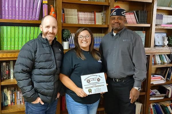 January 14, 2026 - Joaquin High School teacher, Heaven Umbrell recently received her VFW Post 8904 Teacher of the Year award for 2025-2026. On Monday, January 12, Post Commander Derrick Roberts presented her with a framed certificate and a check for $200. Also on hand was Joaquin High School Principal Jonathan Jones.