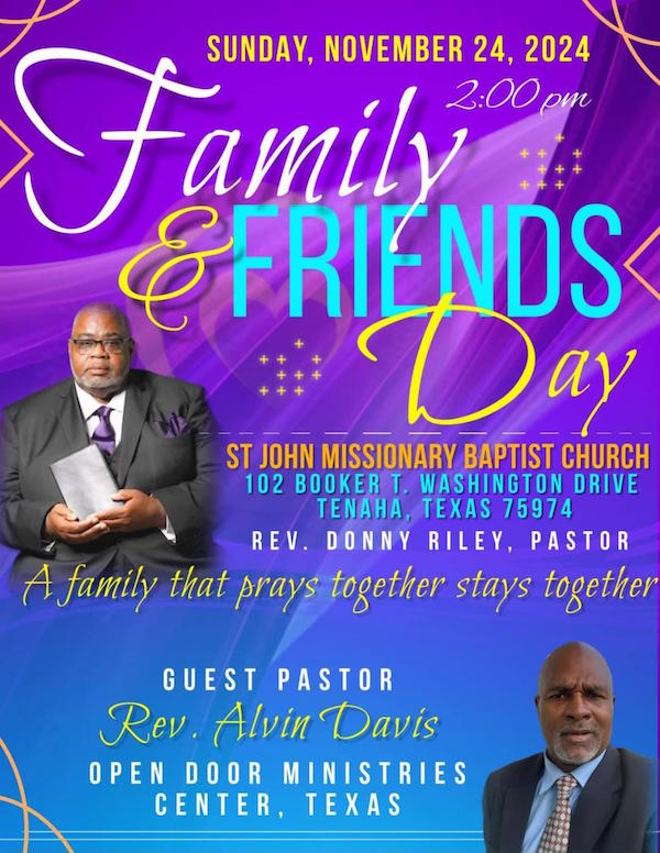August 26, 2024 - Pastor Riley and the St. John Baptist Church of Tenaha, Texas will be celebrating their Annual Homecoming and Revival on Sunday, August 25, 2024 at 11am. Pastor Riley will bring the message.
