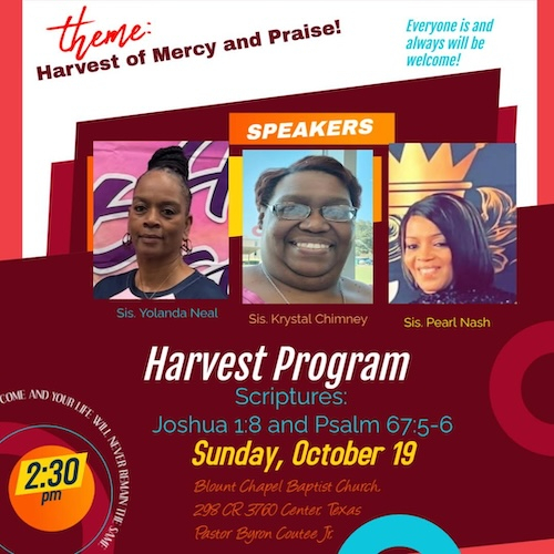 October 18, 2025 - Blount Chapel Baptist Church Harvest Program is Sunday, October 19, 2025 at 2:30pm. Guest speakers are Sis. Yolanda Neal , Sis. Krystal Chimney, and Sis. Pearl Nash.